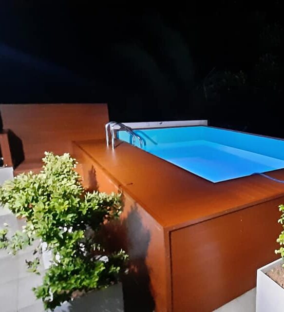 “Space-optimized plunge pool with glass mosaic tiles and waterfall feature, designed for limited urban spaces. Includes built-in seating, mood lighting, and silent operation pumps for peaceful city living.”