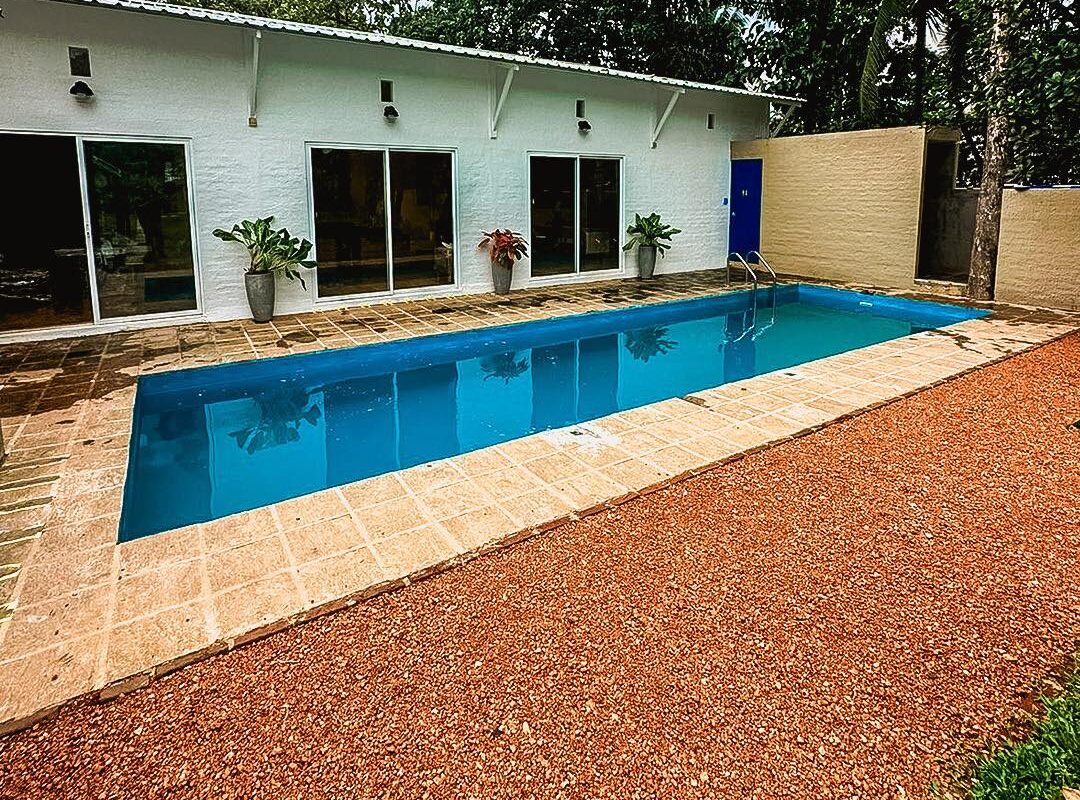 “Grand resort-style pool with natural stone coping, multiple water features, and built-in sun shelf. Complete with swim-up bar, hydrotherapy jets, and energy-efficient filtration system serving commercial guest capacity.”